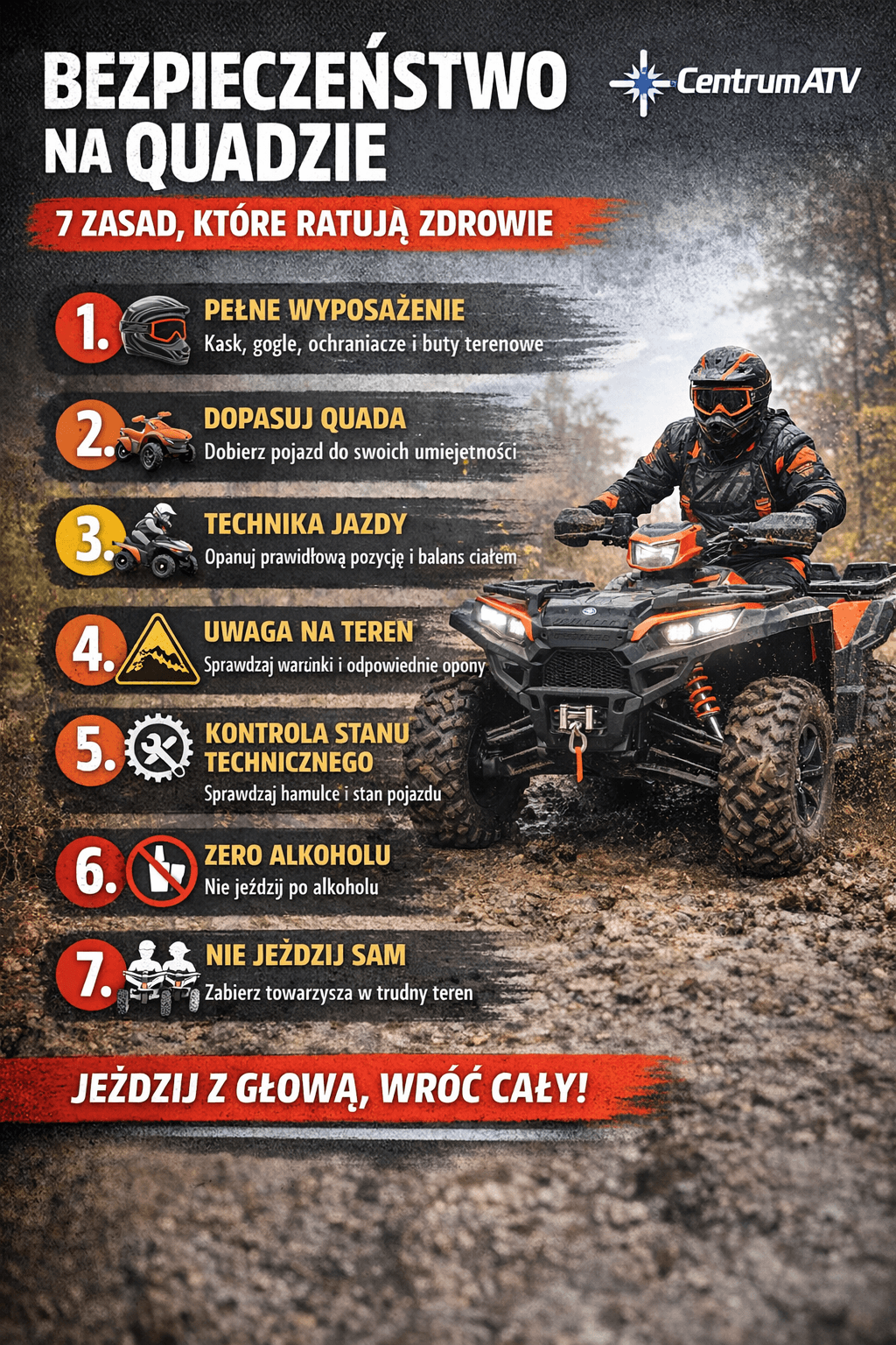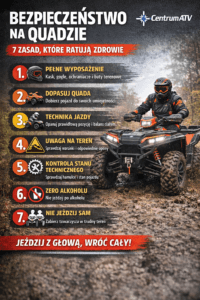 Jazda quadem to adrenalina, wolność i świetna zabawa – ale tylko wtedy, gdy idzie w parze z rozsądkiem. ATV to maszyna o dużej mocy, wysokim środku ciężkości i ogromnych możliwościach terenowych. Właśnie dlatego bezpieczeństwo powinno być zawsze na pierwszym miejscu – niezależnie od tego, czy jeździsz rekreacyjnie, sportowo czy użytkowo.